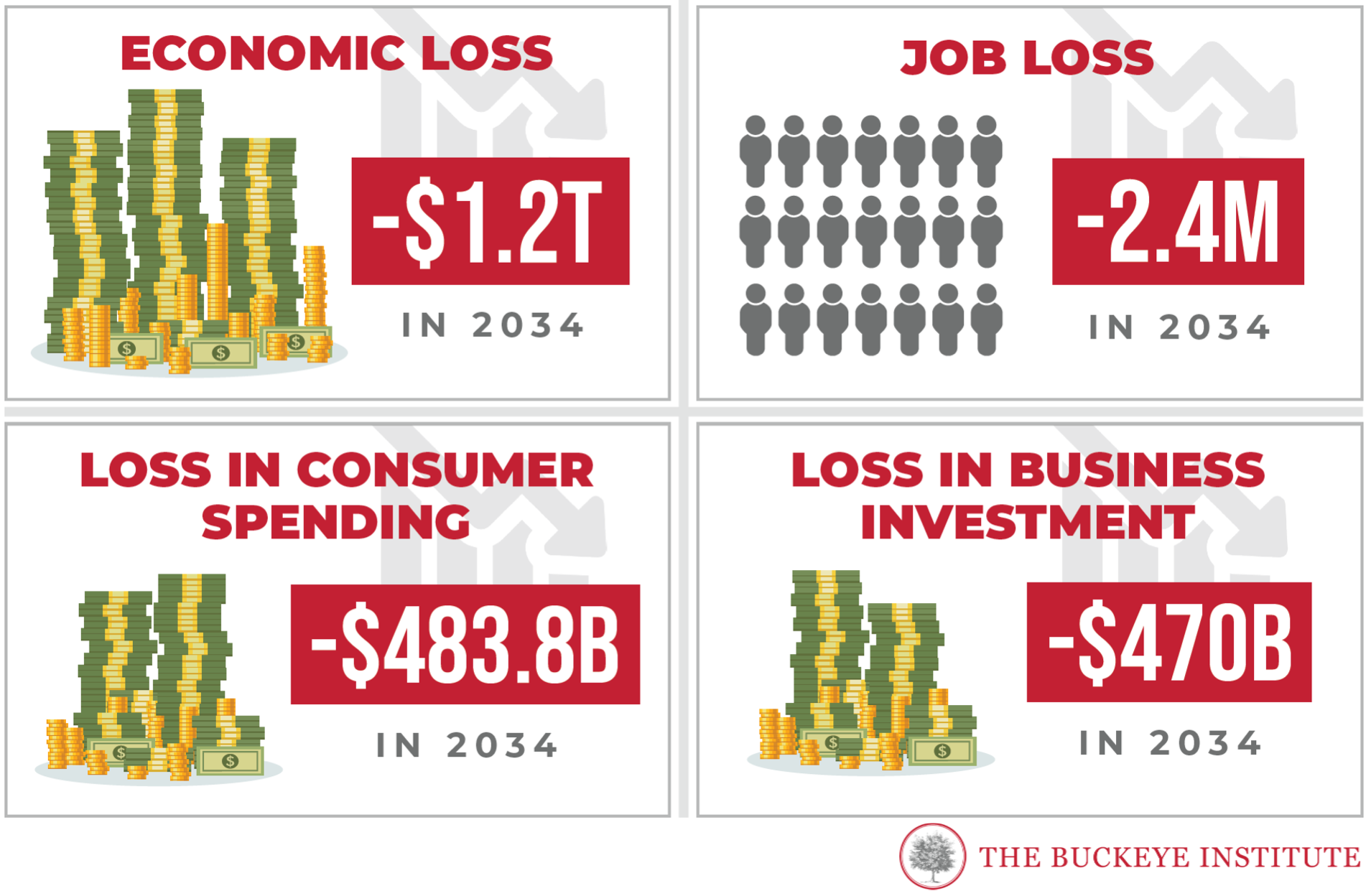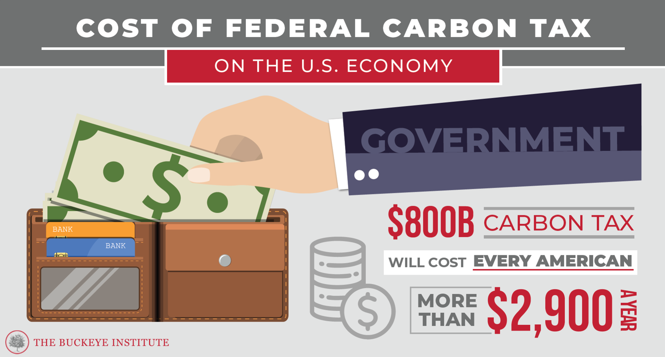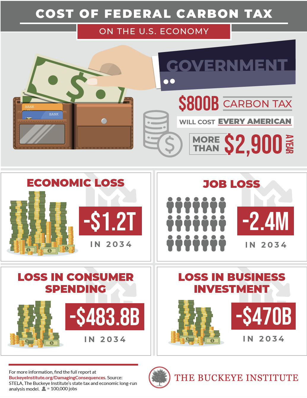 Columbus, OH – In a new policy report, Damaging Consequences, The Buckeye Institute models the economic impact that a federal carbon tax would have on the U.S. economy, job creation, tax collection, consumer spending, and business investment. Buckeye’s economic modeling revealed that an $800 billion annual carbon tax would cost every American $2,900 annually and devastate the U.S. economy, resulting in  $1.2 trillion in economic loss in 2034.